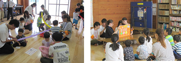 松山大学のVYS部のお兄さん、お姉さんが来られて、バルーンアートや紙芝居、いろんなゲームで一緒に遊びました。子どもたちは教えてもらって紙芝居を披露する側に回ってみたりと楽しい時間を過ごしました。また来てねー♪