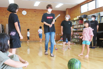 スイカの贈り物があり、「せっかくだからいただく前に楽しんでみよう」となりました。ホントに割れたら大変!新聞丸めて目をつぶって挑戦です。